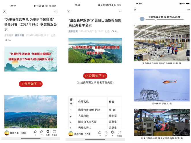 “電約拍”2.0項目實施以來,重點培養(yǎng)團隊成員17名,輻射帶動80余名基層通訊員實戰(zhàn)能力提升,9名同志被山西攝影家協(xié)會吸收為會員。2024年,在人民日報、新華社、山西電視臺、山西日報、國家電網(wǎng)各類媒體平臺發(fā)表圖片594幅、視頻報道335條,分別同比增長430%、177%,宣傳績效得到有效提升,為企業(yè)高質(zhì)量發(fā)展?fàn)I造了良好的內(nèi)外部輿論環(huán)境?!半娂s拍”團隊創(chuàng)作的《稻田喜事》《表里山河處處皆新色》等視頻作品獲得全國品牌故事大賽一等獎;短視頻“凌空一擊”全網(wǎng)點擊量超2億,評論、轉(zhuǎn)發(fā)次數(shù)過萬。人民攝影報先后以三個整版對“光影筑夢 點亮河?xùn)|”“與光同行 一路奮晉”“光影中的晉電力量”主題進行圖文報道。
