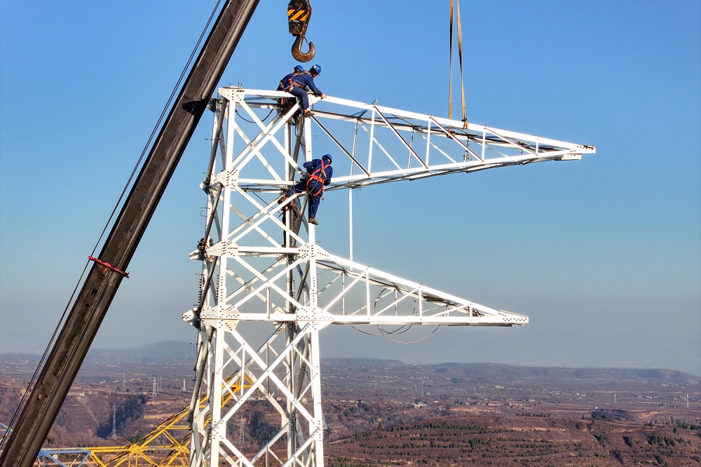 11月25日,國網運城供電公司施工人員正在220千伏桃平線防覆冰改造工程現(xiàn)場組立鐵塔。