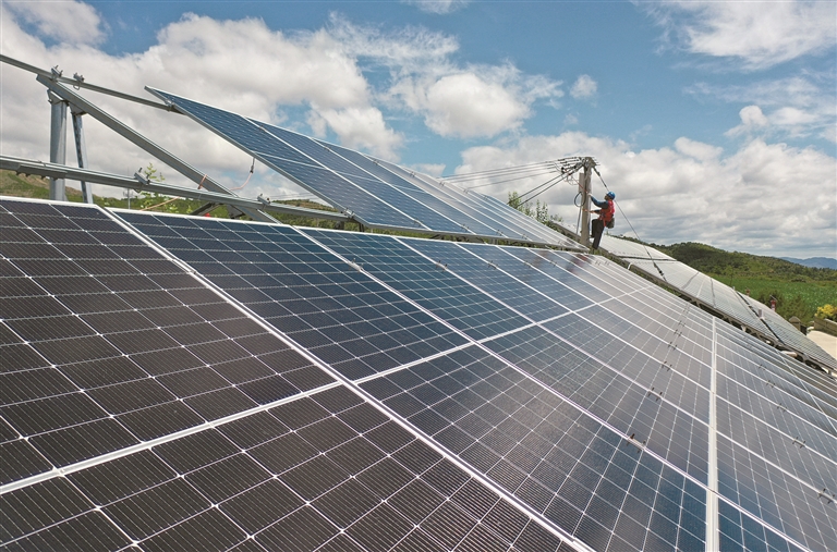 國網(wǎng)天鎮(zhèn)縣供電公司太行黎明共產(chǎn)黨員服務(wù)隊(duì)隊(duì)員在谷前堡鎮(zhèn)白羊口村對(duì)分布式屋頂光伏進(jìn)行隱患排查。
